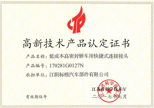 日前,我司低成本高密封轿车用快捷式连接接头获江苏省科学技术厅颁发的高新技术产品认定证书。
