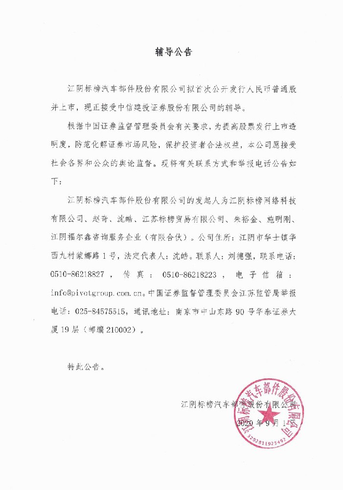 江阴标榜汽车部件股份有限公司拟首次公开发行人民币普通股并上市,现正接受中信建投证券股份有限公司的辅导。
